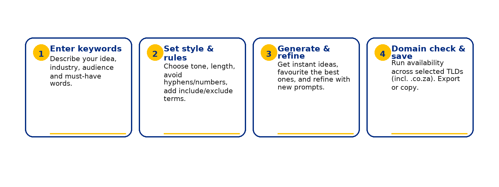 You provide keywords, industry, tone (e.g., modern, luxury, playful), and optional constraints (length, avoid words). The AI blends these into short, memorable options.