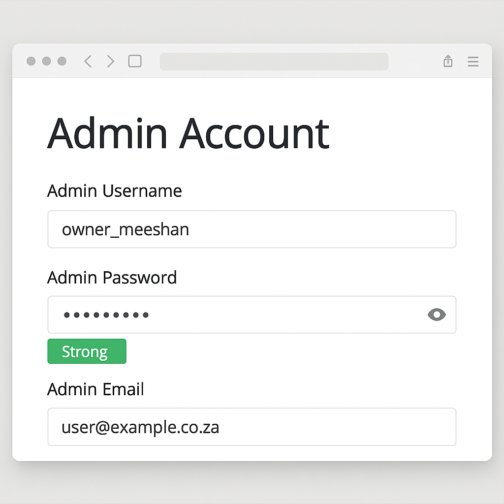 1. Admin Username: Avoid “admin”; use something unique (e.g., owner_meeshan).