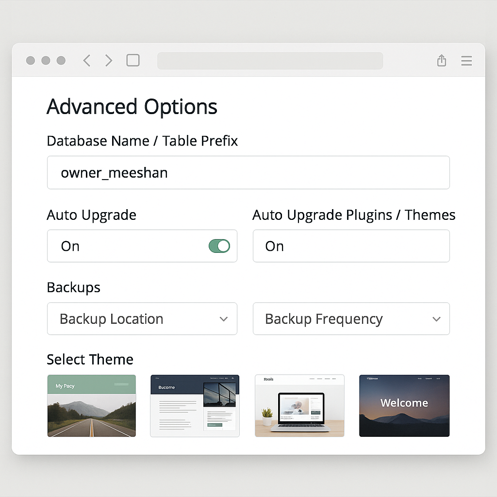 2. Plugins (optional): You can tick Loginizer / Limit Login Attempts for basic brute-force protection (optional).